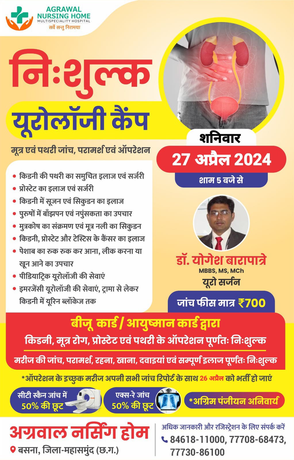 बसना : निःशुल्क यूरोलॉजी कैंप मूत्र एवं पथरी जांच, परामर्श एवं ऑपरेशन!बसना अग्रवाल नर्सिंग होम में 27 अप्रैल 2024 शाम 5 बजे से