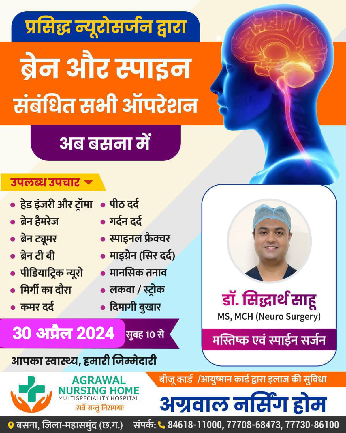 बसना : प्रसिद्ध न्यूरोसर्जन द्वारा ब्रेन और स्पाइन संबंधित सभी ऑपरेशन अग्रवाल नर्सिंग होम बसना में 30 अप्रैल 2024 सुबह 10 से