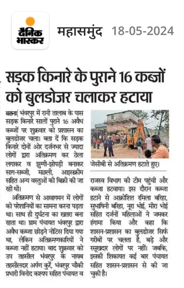 बसना भंवरपुर में रानी तालाब के पास सडक़ किनारे दोनों ओर दर्जन भर से ज्यादा अवैध कब्जा को नायब तहसीलदार, चौकी प्रभारी सहित पंचायत, राजस्व विभाग की टीम ने हटाया। जिले के ग्राम भंवरपुर में रानी तालाब के पास सडक़ किनारे