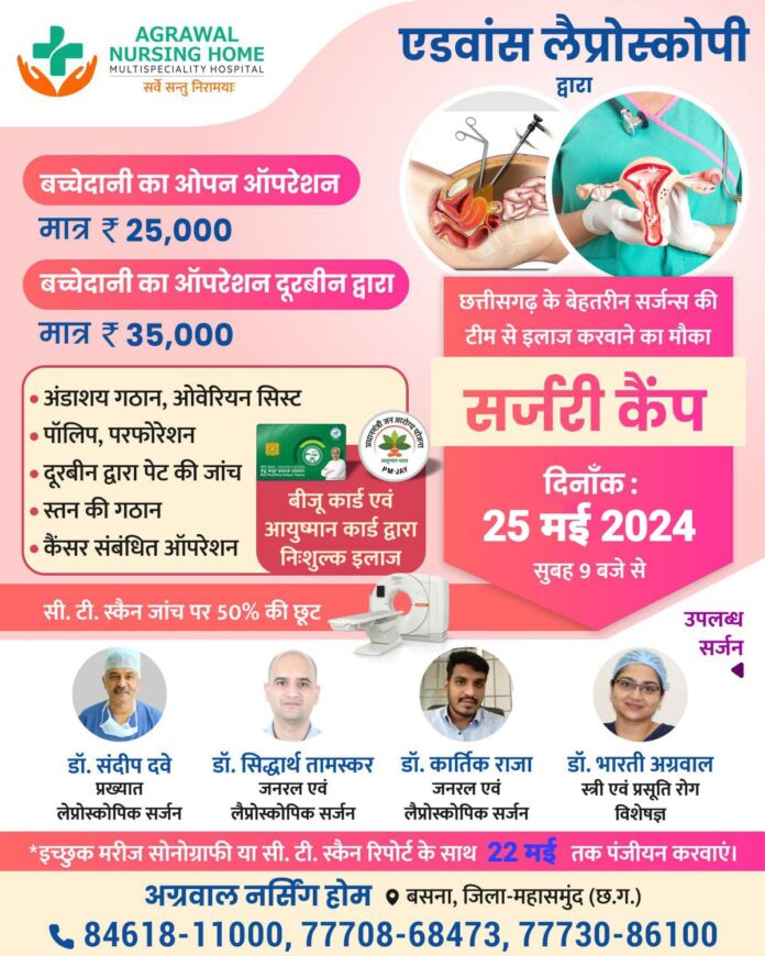 बसना : छत्तीसगढ़ के बेहतरीन सर्जन्स की टीम अग्रवाल नर्सिंग होम में 25 मई 2024 सुबह 9 बजे से