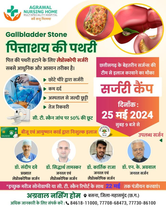 बसना : छत्तीसगढ़ के बेहतरीन सर्जन्स की टीम अग्रवाल नर्सिंग होम में पित्ताशय की पथरी पित्त की पथरी का लैप्रोस्कोपी सर्जरी से इलाज 25 मई 2024 सुबह 9 बजे से