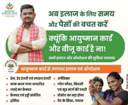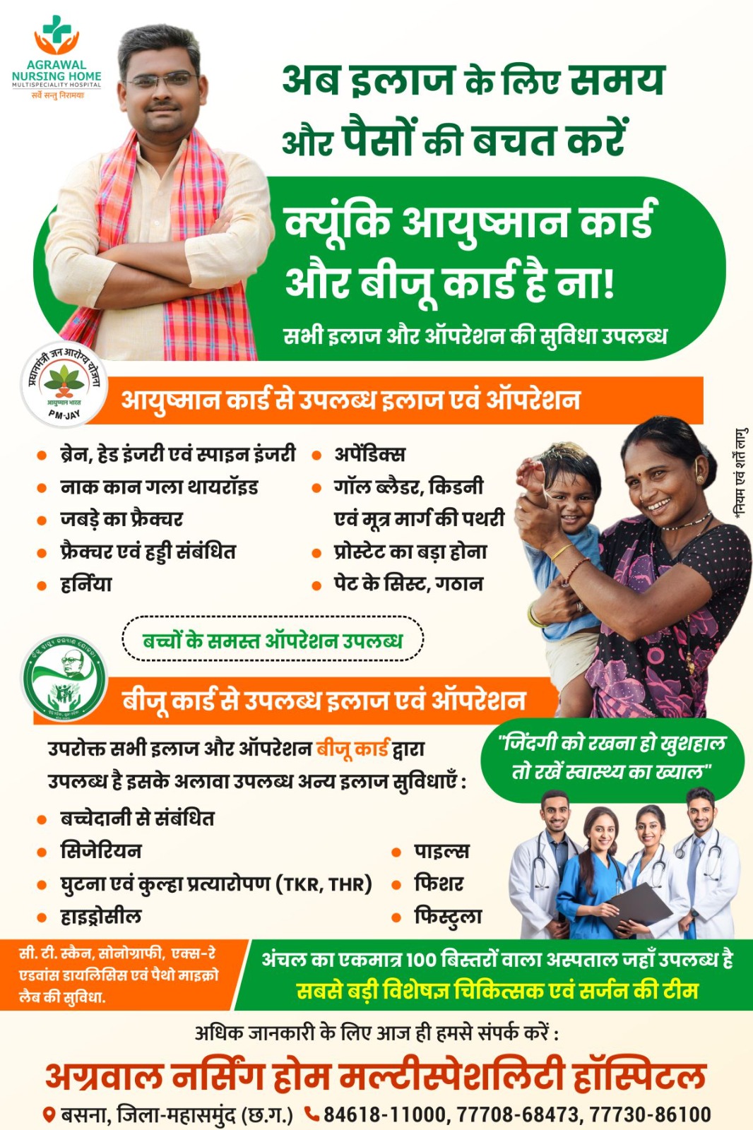 अग्रवाल नर्सिंग होम बसना मे छत्तीसगढ़ और ओड़िसा वासियों के लिए आयुष्मान कार्ड और बीजू कार्ड सभी इलाज और ऑपरेशन की सुविधा उपलब्ध!