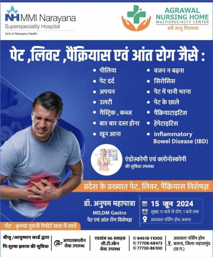 बसना / प्रदेश के प्रख्यात पेट, लिवर, पैंक्रियास विशेषज्ञ 15 जून को अग्रवाल नर्सिंग होम बसना मे!