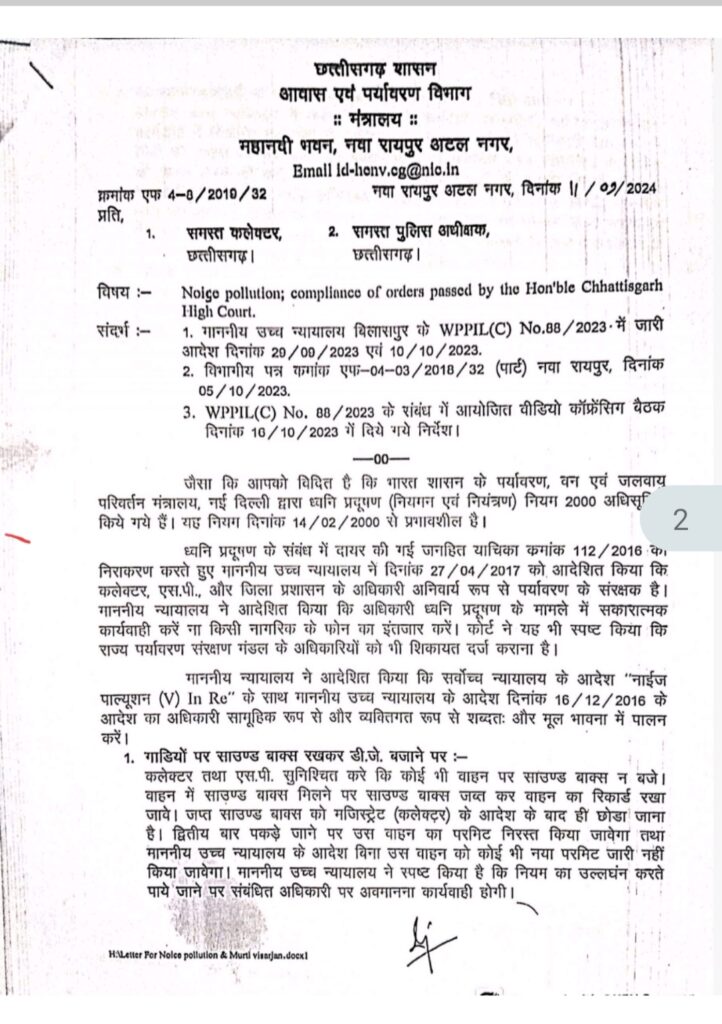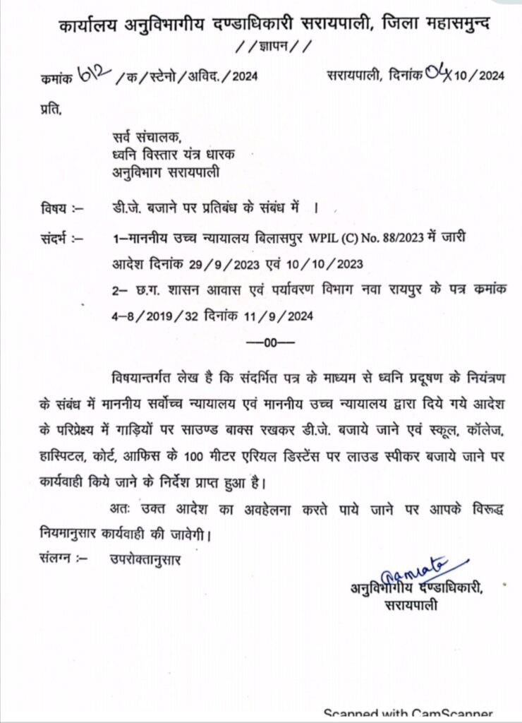 उच्चतम न्यायालय एवं छत्तीसगढ़ शासन आवास एवं पर्यावरण विभाग द्वारा ध्वनि प्रदूषण को नियंत्रित करने हेतु जारी निर्देश के परिपालन में सरायपाली SDM नम्रता चौबे ने जिले में विद्यार्थियों की पढ़ाई, वृद्धाओं, निःशक्तजनों, रोगियों आदि की बाधा एवं परित्रास तथा लोक परिशांति को बनाए रखने के लिए कोलाहल नियंत्रण अधिनियम के तहत सीमा के अंतर्गत बिना लिखित पूर्वानुमति के ध्वनि विस्तारक यंत्रों के प्रयोग को आगामी आदेश तक प्रतिबंधित करने के निर्देश दिए हैं। SDM ने स्कूल कॉलेज अस्पताल कोर्ट क़े नजदीक लाउडस्पीकर बजाते पाए जाने पर कार्यवाही क़े निर्देश दिए है!