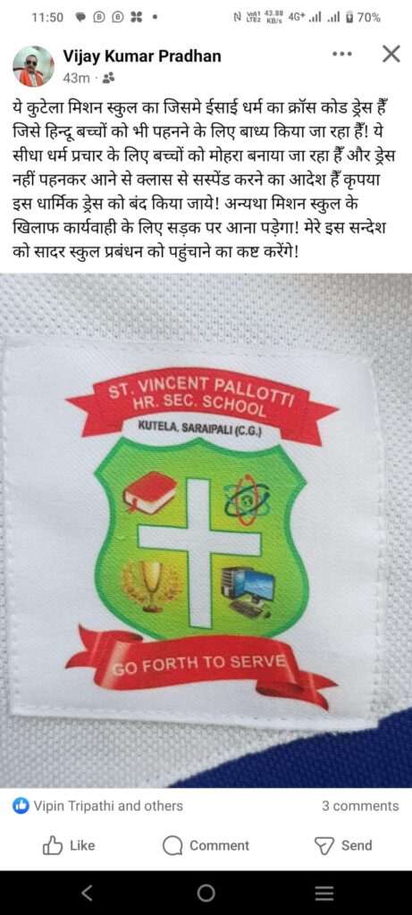 महासमुंद जिले क़े सरायपाली ब्लाक अंतर्गत ग्राम कुटेला क़े मिशन स्कूल पर धार्मिक प्रचार का आरोप लग रहे है इस संबंध मे ब्लॉक शिक्षा अधिकारी मांझी के पास शिकायत भी पंहुचा है वही भाजपा कार्यकर्ता विजय कुमार प्रधान ने सोशल मिडिया पर निशाना साधते हुए लिखा है की इस धार्मिक ड्रेस को बंद किया जाए अन्यथा मिशन स्कूल क़े खिलाप सड़क पर आना होगा आरोप है की कुटेला क़े मिशन स्कूल मे ईसाई धर्म का क्रास कोड ड्रेस है जिसे हिन्दू विधार्थियो को भी पहनने मजबूर किया जा रहा है विनय कुमार प्रधान भाजपा कार्यकर्ता क़े अनुसार धर्म प्रचार क़े लिए बच्चों को