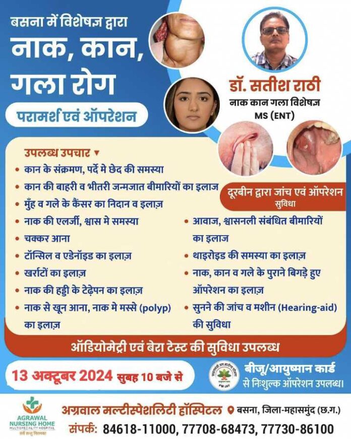 बसना / अग्रवाल मल्टीस्पेशलिटी हॉस्पिटल में विशेषज्ञ द्वारा,नाक, कान, गला रोग परामर्श एवं ऑपरेशन