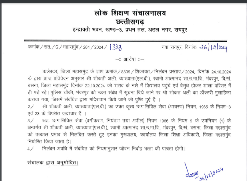 महासमुंद। बसना ब्लॉक के शासकीय उच्चतर माध्यमिक विद्वालय भंवरपुर के आत्मानंद स्कूल के लेक्चचर शौकत अली शराब के नशे में स्कूल पहुंच गया था। इसके कारण यहां शिक्षकों और छात्रों में खलबली मच गया था। 22-23 नवबंर 2024 की ये घटना है। हालाकिं, देर आए दुरस्त अब लोक शिक्षण संचालनालय ने सस्पेंड कर दिया है।
