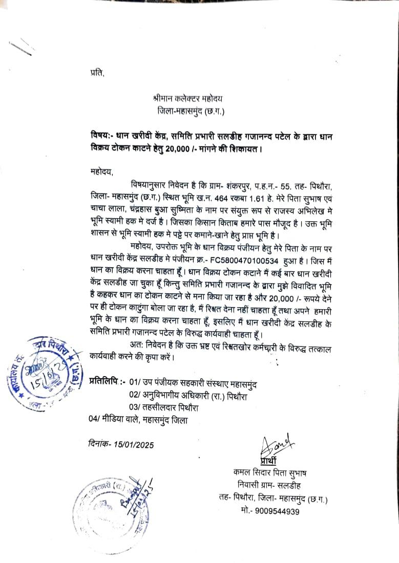 लेकिन कमल सिदार रिश्वत देना नहीं चाहता है और अपने खेत की धान को बेचना चाहता है इसलिए धान खरीदी केंद्र सलडीह के समिति प्रभारी गजानंद पटेल के खिलाफ कमल सिदार ने शपथ पत्र के साथ कलेक्टर से शिकायत कर कार्यवाही की मांग की है ।