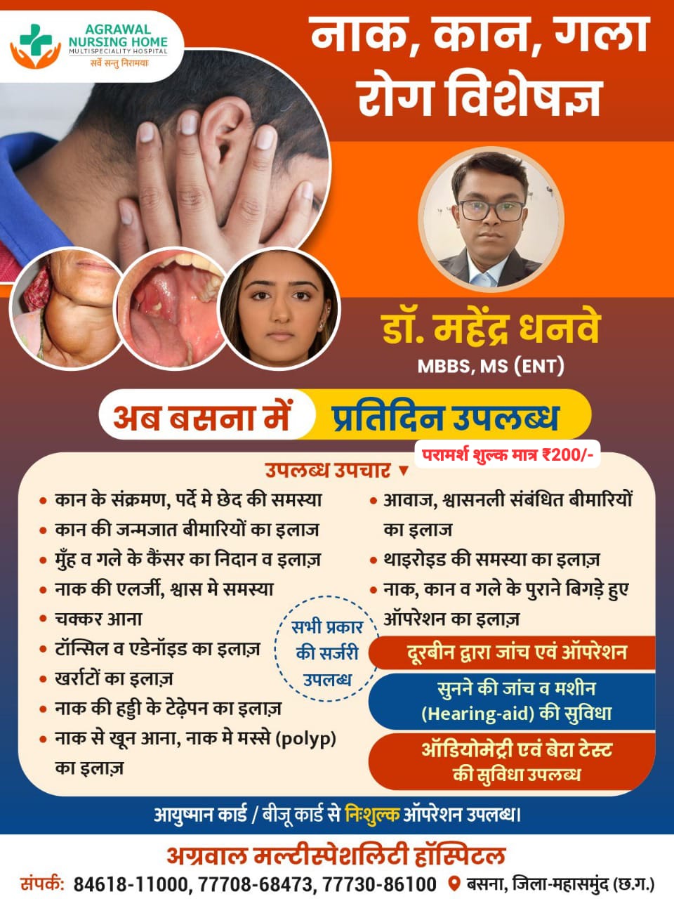 संपर्क: 84618-11000, 77708-68473, 77730-86100 बसना, जिला महासमुंद (छ.ग.)नाक, कान, गला