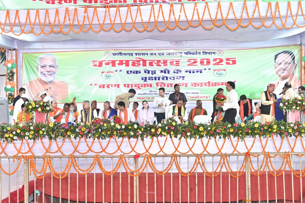 महासमुंद, 10 अगस्त 2025/ बसना विकासखंड के ग्राम दुर्गापाली में आज एक पेड़ मां के नाम एवं चरण पादुका वितरण कार्यक्रम का आयोजन बड़े उत्साह के साथ किया गया। मुख्यमंत्री श्री विष्णु देव साय ने यहां देव वृक्ष रुद्राक्ष का पौधरोपण किया एवं 50 तेंदूपत्ता हितग्राहियों को चरण पादुका वितरण किया। उन्होंने अपनी माता जी श्रीमती जसमनी देवी के नाम से वृक्षारोपण किया। इस अवसर पर राजस्व मंत्री श्री टंकराम वर्मा, जगदलपुर विधायक श्री किरण सिंह देव, उत्तर रायपुर विधानसभा के विधायक श्री पुरंदर मिश्रा, बसना विधायक श्री संपत अग्रवाल, सरायपाली विधायक श्रीमती चातुरी नंद, श्री अजय जामवाल,रायपुर नगर निगम की अध्यक्ष मिनल चौबे, छत्तीसगढ़ बीज निगम के अध्यक्ष श्री चंद्रहास चंद्राकर, महिला आयोग की अध्यक्ष श्रीमती सरला कोसरिया, श्री येतराम साहू, जिला पंचायत अध्यक्ष श्रीमती मोंगरा पटेल, नगर पालिका अध्यक्ष श्रीमती सरस्वती मिलो पटेल, पूर्व सांसद श्री चुन्नीलाल साहू, पूर्व राज्य मंत्री श्री पूनम चंद्राकर, कलेक्टर श्री विनय लंगेह, पुलिस अधीक्षक श्री आशुतोष सिंह, मंडलाधिकारी मयंक पांडेय, जिला अधिकारी व जनप्रतिनिधि एवं बड़ी संख्या में ग्रामीण जन उपस्थित थे।