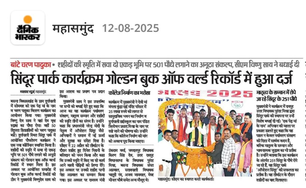 छत्तीसगढ़ बसना: दुर्गापाली का सिंदूर पार्क वर्ल्ड रिकॉर्ड में दर्ज, हाईस्कूल का नाम पंडित त्रिलोचन प्रसाद मिश्रा के नाम पर, CM का कई घोषणा और सम्मान