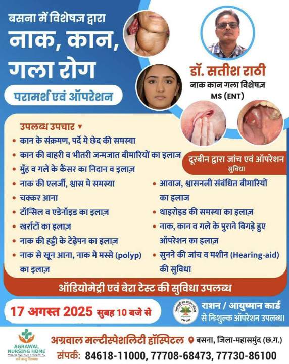 महासमुंद/बसना। अग्रवाल मल्टीस्पेशलिटी हॉस्पिटल, बसना में 17 अगस्त 2025 को सुबह 10 बजे से नाक, कान एवं गला रोगों के विशेषज्ञ डॉ. सतीश राठी (MS ENT) द्वारा विशेष परामर्श एवं ऑपरेशन की सुविधा उपलब्ध कराई जाएगी।