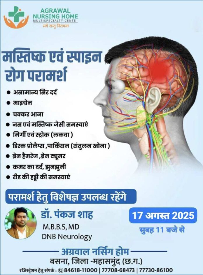 बसना में अग्रवाल नर्सिंग होम में मस्तिष्क एवं स्पाइन रोग परामर्श शिविर 17 अगस्त को
