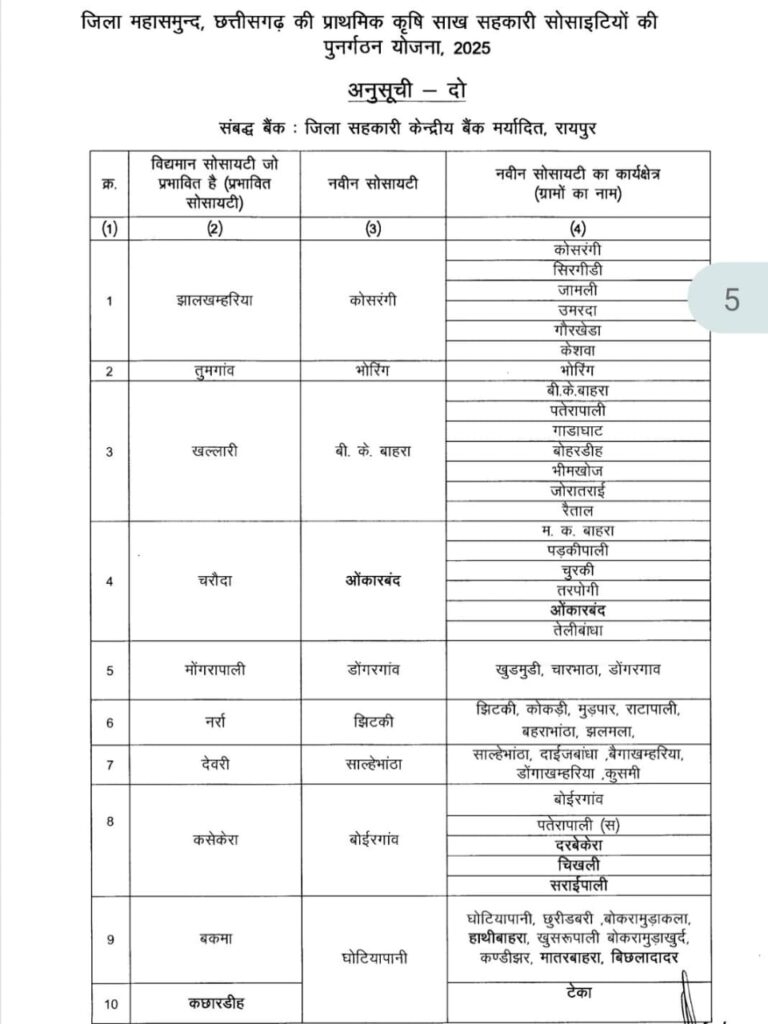 नवा रायपुर, छत्तीसगढ़ शासन के सहकारिता विभाग ने महासमुंद जिले की प्राथमिक कृषि साख सहकारी सोसायटियों (PACS) के पुनर्गठन की प्रक्रिया शुरू कर दी है। इसके लिए विभाग ने “पुनर्गठन योजना 2025” के अंतर्गत अनुसूची-एक, दो एवं तीन जारी की है।