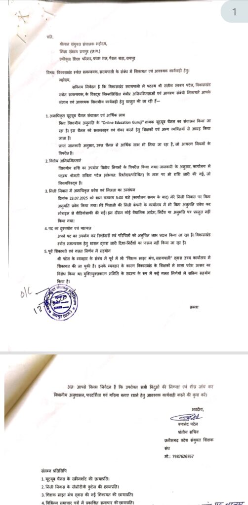 शिकायत में कहा गया है कि शिक्षक साझा मंच, सरायपाली द्वारा पहले भी श्री पटेल के खिलाफ उच्च अधिकारियों को शिकायत की गई थी। आरोप है कि उनके व्यवहार के चलते शिक्षकों ने शाला प्रवेश उत्सव का विरोध किया। साथ ही, युक्तियुक्तकरण समिति में भी उन्होंने कई गलत निर्णयों में सक्रिय सहयोग किया।