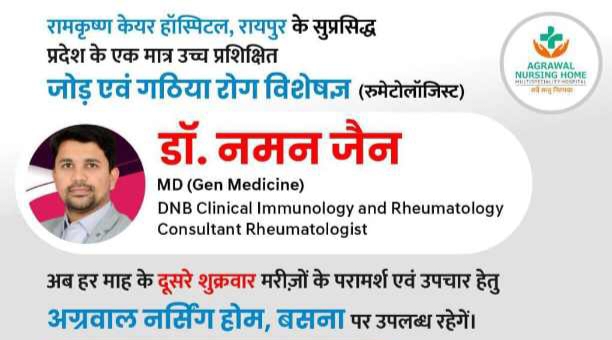बसना। गठिया और जोड़ों के दर्द से परेशान मरीजों के लिए राहत भरी खबर है। रायपुर के रामकृष्ण केयर हॉस्पिटल के प्रसिद्ध रूमेटोलॉजिस्ट डॉ. नमन जैन अब हर माह के दूसरे शुक्रवार को अग्रवाल नर्सिंग होम, बसना में मरीजों को परामर्श और इलाज देंगे।