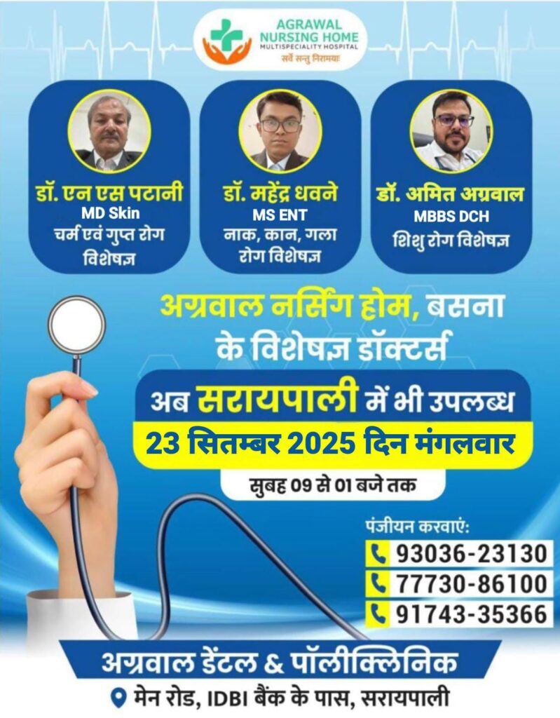 सरायपाली। स्वास्थ्य सुविधाओं के विस्तार की दिशा में एक महत्वपूर्ण पहल करते हुए अग्रवाल नर्सिंग होम, बंसना के विशेषज्ञ डॉक्टर अब सरायपाली में भी अपनी सेवाएँ देंगे। इससे नगर एवं आसपास के ग्रामीण मरीजों को घर के नजदीक ही परामर्श और उपचार की सुविधा प्राप्त होगी।