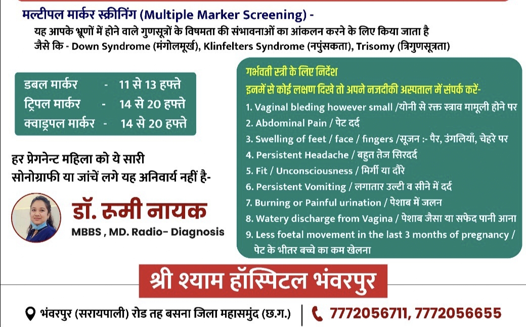 महासमुंद भंवरपुर : श्री श्याम हॉस्पिटल में गर्भवती महिलाओं के लिए आधुनिक सोनोग्राफी जांच सुविधा उपलब्ध