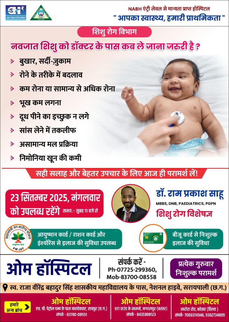 सरायपाली के ओम हॉस्पिटल में आज 11 बजे से शिशु रोग विशेषज्ञ डॉ. राम प्रकाश साहू देंगे विशेष चिकित्सा परामर्श