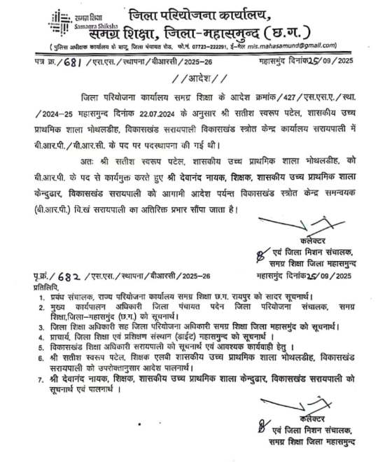 महासमुंद। समग्र शिक्षा जिला परियोजना कार्यालय महासमुंद ने सोमवार 25 सितम्बर 2025 को पदस्थापना आदेश जारी किया है। आदेश क्रमांक 681/एस.एस./स्थापना/बीआरसी/2025-26 के तहत शिक्षक देवानंद नायक को विकासखंड सरायपाली अंतर्गत समन्वयक (बी.आर.सी.) का अतिरिक्त प्रभार सौंपा गया है।
