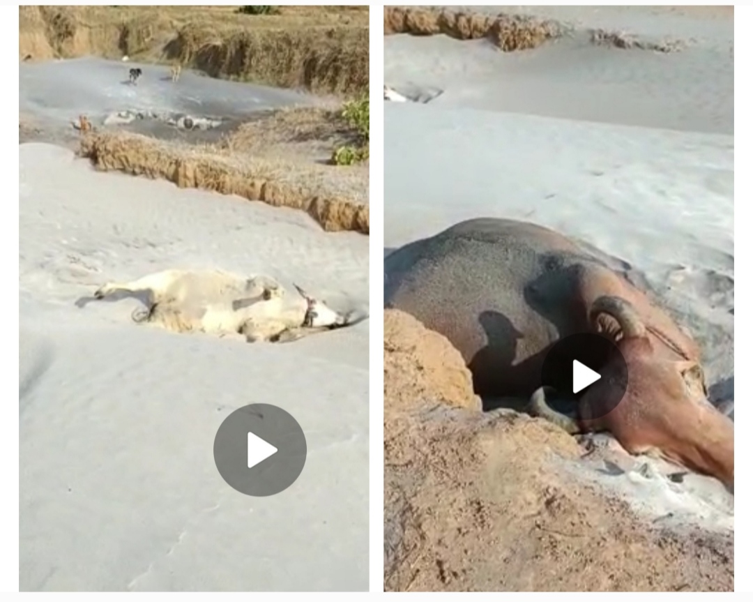 महासमुंद -/गर्म राख में फंसकर 2 पषुओ की दर्दनाक मौत जिले भर में कई राइसमिल वाले जहां तहां कर रहे है डंपिग रास्ते मे भी उड़ते रहते है राखड़