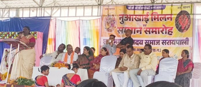 युधिष्ठिर छतर ने माँ समलाई भजन से देवी का आह्वान किया। कार्यक्रम के मुख्यअतिथि चातुरी डिग्रीलाल नंद,अध्यक्षता हीराधार बगर्ती ब्लॉक अध्यक्ष मगधा यादव समाज सरायपाली, विशिष्ट अतिथि मोंगरा किशन पटेल अध्यक्ष जि.पं. महासमुंद, लक्ष्मी हरिश्चंद्र पटेल अध्यक्ष ज. पं. सरायपाली, कुमारी धनेश्वर भास्कर सदस्य जि. पं. महासमुंद, लोकनाथ बारी सदस्य जि. पं. महासमुंद, बालमोती रेशम पटेल सदस्य ज. पं. सरायपाली, सबिता नंद सरपंच ग्रा. पं. अर्जुण्डा़, त्रिपुरा चित्रसेन बिशी सरपंच ग्रा. पं. देवलभांठा, प्रखर अग्रवाल संस्थापक संगम सेवा समिति सरायपाली, संरक्षक मगधा यादव समाज ध्रुव मलिक, रथराम यादव, प्रदेश कोषाध्यक्ष संतोष यादव, प्रदेश संगठन मंत्री डॉ पवन कुमार यादव, जिलाध्यक्ष महासमुंद शरद हंसराज, जिला सचिव ओम प्रकाश छत्रपति, मनोहर यादव परिक्षेत्र अध्यक्ष बागबाहरा, कन्हैया यादव परिक्षेत्र अध्यक्ष खल्लारी, ब्लॉक उपाध्यक्ष मदन दीप,शाखा अध्यक्ष देवलभांटा कृष्टो टाणी, शाखा अध्यक्ष पोडा़गढ़ फकीर कठार, शाखा अध्यक्ष छुईपाली मोहर सिंह कार्यकारी अध्यक्ष प्रकाश भोई कर्मठ समाजसेवी विजय यादव मंचासीन थे। अतिथियों का स्वागत तिलक चंदन लगाकर, पुष्पहार, राधे गमछा,पगड़ी पहनाकर किया गया। मुख्य अतिथि विधायक नंद जी ने सभी यादव बंधुओं को नुआखाई की बधाई देते हुए कहा कि मगधा यादव समाज शिक्षा, संस्कृति और एकता के पथ पर हमेशा अग्रसर रहा है