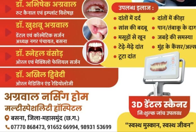बसना में 5 अक्टूबर को निःशुल्क दंत शिविर,मरीजों को निःशुल्क परामर्श, जांच एक्स-रे की सुविधा साथ ही अन्य उपचारों पर विशेष छूट भी उपलब्ध होगी।अग्रवाल नर्सिंग होम मे महासमुंद। अग्रवाल नर्सिंग होम मल्टीस्पेशलिटी हॉस्पिटल, बसना में 5 अक्टूबर 2025 को निःशुल्क दंत चिकित्सा शिविर का आयोजन किया जा रहा है। यह शिविर सुबह 10 बजे … Continue reading बसना में 5 अक्टूबर को निःशुल्क दंत शिविर,मरीजों को निःशुल्क परामर्श, जांच एक्स-रे की सुविधा साथ ही अन्य उपचारों पर विशेष छूट भी उपलब्ध होगी।अग्रवाल नर्सिंग होम मे
