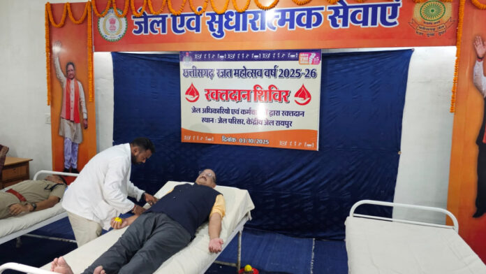 राज्य शासन के निर्देशानुसार छत्तीसगढ़ स्थापना की रजत जयंती के उपलक्ष्य में जेल एवं सुधारात्मक सेवाएं विभाग द्वारा 3 अक्टूबर से 10 अक्टूबर 2025 तक रजत महोत्सव का आयोजन किया जा रहा है। इस महोत्सव का शुभारंभ आज केन्द्रीय जेल रायपुर में रक्तदान शिविर के साथ हुआ।