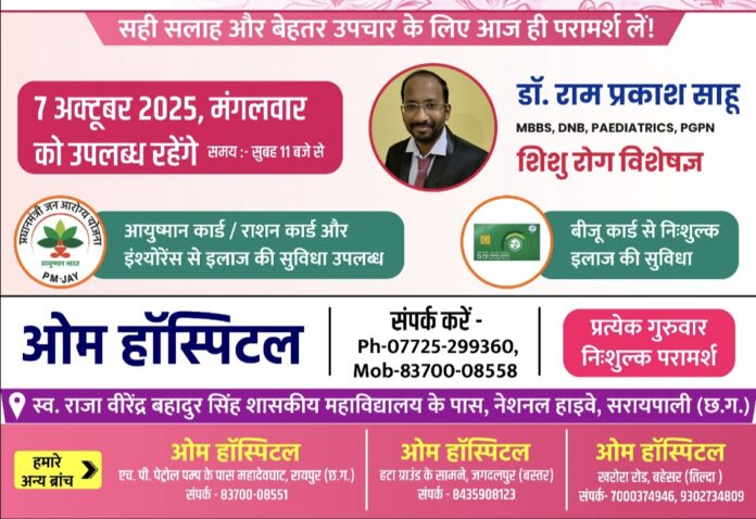 नवजात शिशुओं के स्वास्थ्य को ध्यान में रखते हुए ओम हॉस्पिटल सरायपाली में शिशु रोग विभाग की ओर से एक दिवसीय विशेष परामर्श शिविर आयोजित किया जा रहा है। यह शिविर आगामी 7 अक्टूबर 2025, मंगलवार को सुबह 11 बजे से होगा। संपर्क हेतु :