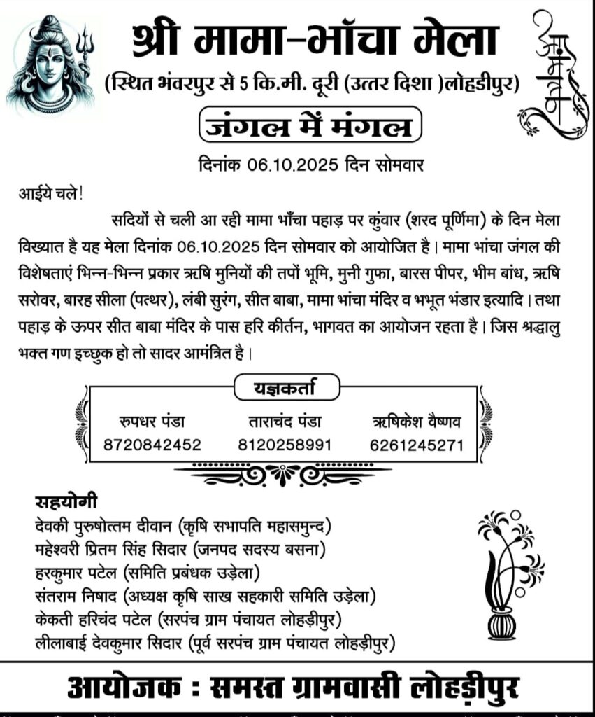 संवाददाता अनुराग नायक बसना: मामा-भाँचा मेला 6 अक्टूबर को, लोहडीपुर में गूंजेगी श्रद्धा की घंटियां ऋषि-मुनियों की तपोभूमि पर उमड़ेगा भक्तों का सैलाब आस्था, परंपरा और अध्यात्म का अनूठा संगम एक बार फिर देखने को मिलेगा। सदियों से चली आ रही मान्यता के अनुसार, श्री मामा-भाँचा मेला इस वर्ष दिनांक 06 अक्टूबर 2025, दिन सोमवार को बड़े धूमधाम से आयोजित किया जा रहा है। यह ऐतिहासिक मेला भंवरपुर से 5 किलोमीटर दूर, उत्तर दिशा में स्थित लोहढ़ीपुर के घने जंगलों में स्थित मामा-भाँचा पहाड़ पर हर साल कुंवर (शरद पूर्णिमा) के अवसर पर मनाया जाता है।