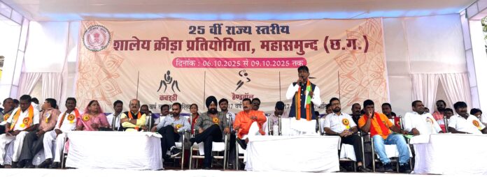 महासमुंद/ जिले में 25वीं राज्य स्तरीय शालेय क्रीड़ा प्रतियोगिता का रंगारंग शुभारम्भ आज विधायक श्री योगेश्वर राजू सिन्हा के मुख्य आतिथ्य में जिला मुख्यालय स्थित मिनी स्टेडियम में हुआ। कार्यक्रम का शुभारम्भ मशाल जलाकर एवं ध्वजारोहरण के माध्यम से किया गया। इस अवसर पर रंग बिरंगे जर्सी में खिलाड़ियों ने मार्च पास्ट किया। विधायक श्री योगेश्वर राजू सिन्हा ने शालेय क्रीड़ा प्रतियोगिता के लिए खिलाड़ियों को खेल भावना से खेलने शपथ दिलाई। यहां शिक्षा विभाग, खेल विभाग एवं प्रतियोगिता से सम्बंधित अधिकारी एवं खेल प्रेमी जनता बड़ी संख्या में मौजूद थे। कार्यक्रम का समापन 9 अक्टूबर 2025 को मिनी स्टेडियम में होगा। प्रतियोगिता का शुभारम्भ के पूर्व अतिथियों ने खिलाड़ियों से हाथ मिलाकर हौसला अफजाई की। इस दौरान स्कूली छात्राओं द्वारा सांस्कृतिक कार्यक्रम की प्रस्तुति भी दी गई। इस अवसर पर स्काउट गाइड के राज्य आयुक्त श्री इंद्रजीत सिंह खालसा, छत्तीसगढ़ बीज निगम के अध्यक्ष श्री चंद्रहास चंद्राकर, स्काउट गाइड संघ के जिलाअध्यक्ष श्री येतराम साहू, जिला हैण्डबाल संघ के अध्यक्ष श्री प्रदीप चंद्राकर, जिला पंचायत उपाध्यक्ष श्री भीखम सिंह ठाकुर, नगरपालिका उपाध्यक्ष श्री देवीचंद राठी एवं कलेक्टर श्री विनय कुमार लंगेह मौजूद थे।