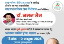 10 अक्टूबर को बसना में गठिया रोग शिविर — रायपुर के प्रसिद्ध रूमेटोलॉजिस्ट डॉ. नमन जैन देंगे परामर्श बसना (जिला महासमुंद)। अग्रवाल नर्सिंग होम, बसना में 10 अक्टूबर 2025 (शुक्रवार) को जोड़ों एवं गठिया रोग से पीड़ित मरीजों के लिए निशुल्क परामर्श शिविर का आयोजन किया जा रहा है। इस शिविर में रामकृष्ण केयर हॉस्पिटल, … Continue reading बसना : अग्रवाल नर्सिंग होम में 10 अक्टूबर को दो विशेष स्वास्थ्य शिविर — जोड़ों का दर्द हो या पथरी की परेशानी, मिलेगा विशेषज्ञ इलाज