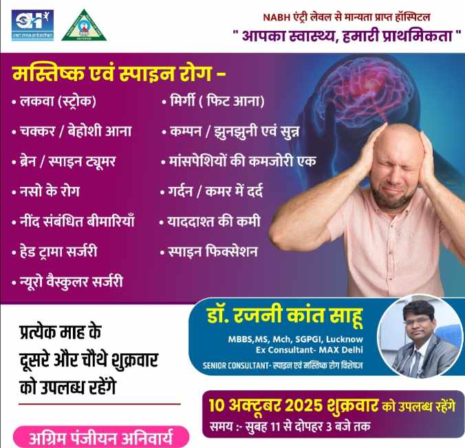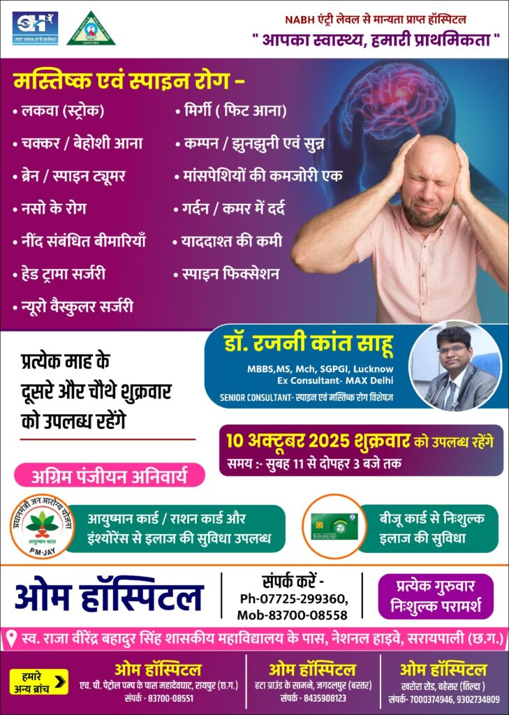 सरायपाली: ओम हॉस्पिटल में 10 अक्टूबर को मस्तिष्क एवं स्पाइन रोग विशेषज्ञ डॉ. रजनीकांत साहू देंगे परामर्श