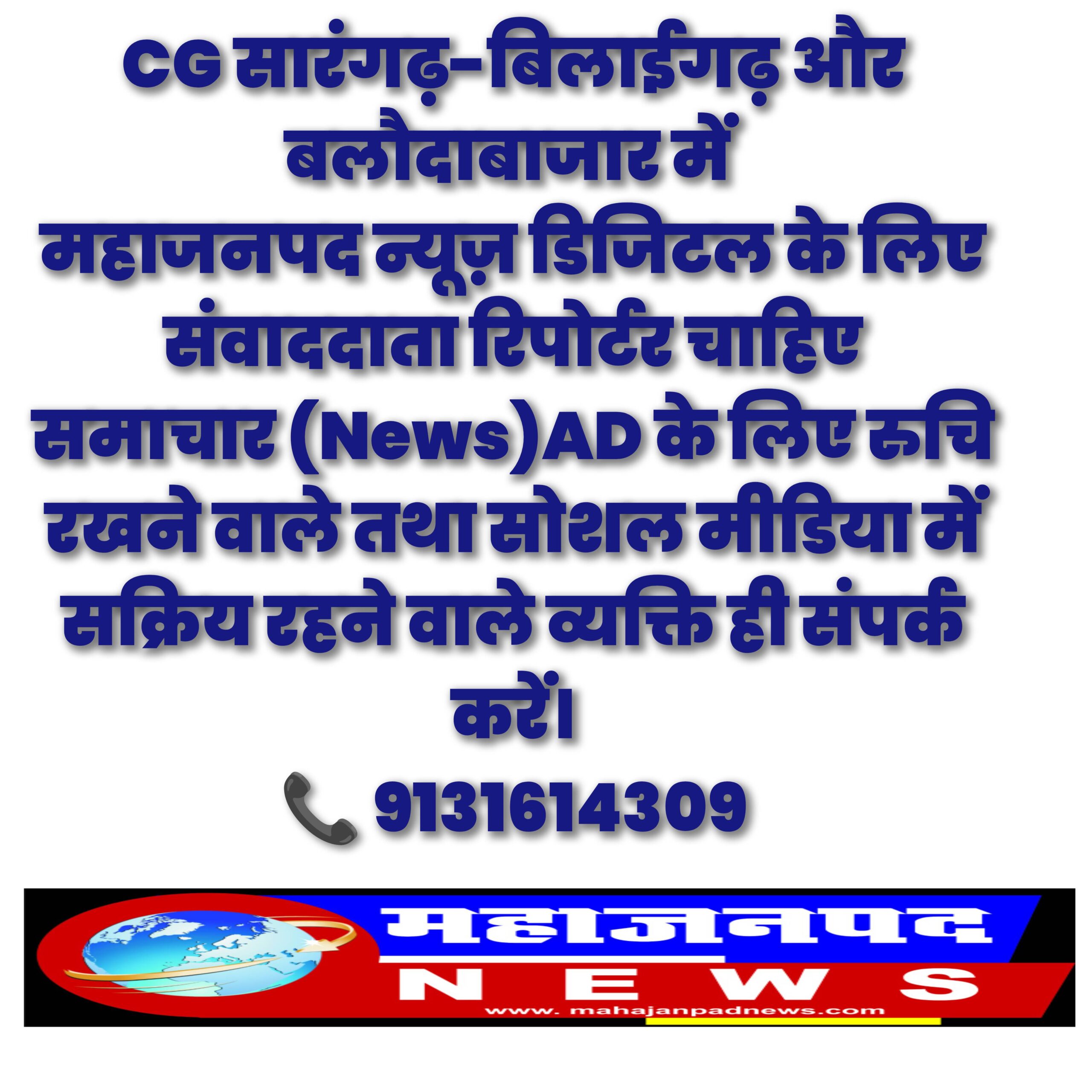 CG : सारंगढ़-बिलाईगढ़ एवं बलौदाबाजार में महाजनपद न्यूज़ डिजिटल को संवाददाता रिपोर्टर की आवश्यकता क्षेत्रीय समाचारों के प्रति रुचि रखने वाले और सोशल मीडिया पर सक्रिय युवाओं के लिए यह एक सुनहरा अवसर है।