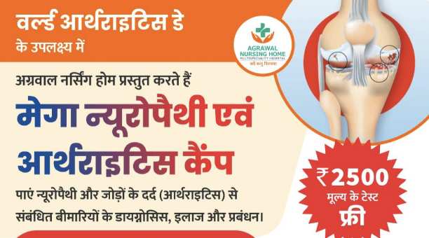 वर्ल्ड आर्थराइटिस डे के अवसर पर अग्रवाल नर्सिंग होम द्वारा मेगा न्यूरोपैथी एवं आर्थराइटिस कैंप का आयोजन किया जा रहा है। यह निःशुल्क स्वास्थ्य शिविर 12 अक्टूबर 2025 को सुबह 9 बजे से शाम 5 बजे तक अग्रवाल मल्टीस्पेशलिटी हॉस्पिटल, बसना में आयोजित होगा। पंजीयन एवं अपॉइंटमेंट के लिए संपर्क करें: