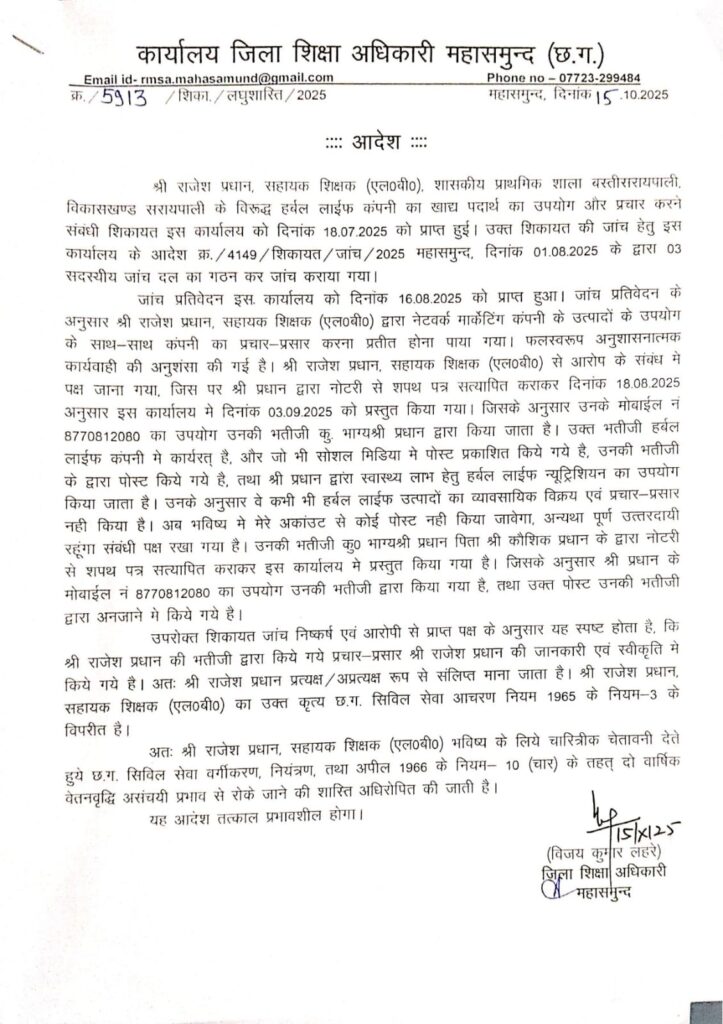 जांच प्रतिवेदन के अनुसार राजेश प्रधान, सहायक शिक्षक द्वारा नेटवर्क मार्केटिंग कंपनी के उत्पादों के उपयोग के साथ-साथ कंपनी का प्रचार-प्रसार करना प्रतीत होना पाया गया। फ्लस्वरूप अनुशासनात्मक कार्यवाही की अनुशंसा की गई है। राजेश प्रधान सहायक शिक्षक से आरोप के सम्बन्ध में पक्ष जाना गया था, जिस पर राजेश प्रधान नोटरी से शपथ पत्र सत्यापित कराकर दिनाक 18/08/2025 अनुसार इस कार्यालय में दिनांक 03/09/2025 को प्रस्तुत किया गया। जिसके अनुसार उनके मोबाईल नम्बर 8770812080 का उपयोग उनकी भतीजी द्वारा किया जाता है। उक्त राजेश प्रधान के भतीजी व्दारा उक्त पोस्ट अनजाने में किया गया। उक्त जांच प्रतिवेदन के आधार पर जिला शिक्षा अधिकारी महासमुन्द (छ.ग.) द्वारा राजेश प्रधान के जानकारी एवं स्वीकृति में किए पोस्ट मानते हुए दो वार्षिक वेतन-वृद्धि असंचयी प्रभाव से रोकें जाने हेतु आदेश जारी किया है। जिला शिक्षा अधिकारी महासमुन्द के इस हुए कार्यवाही आदेश में अनेक प्रश्न चिन्ह खड़े हो गए।