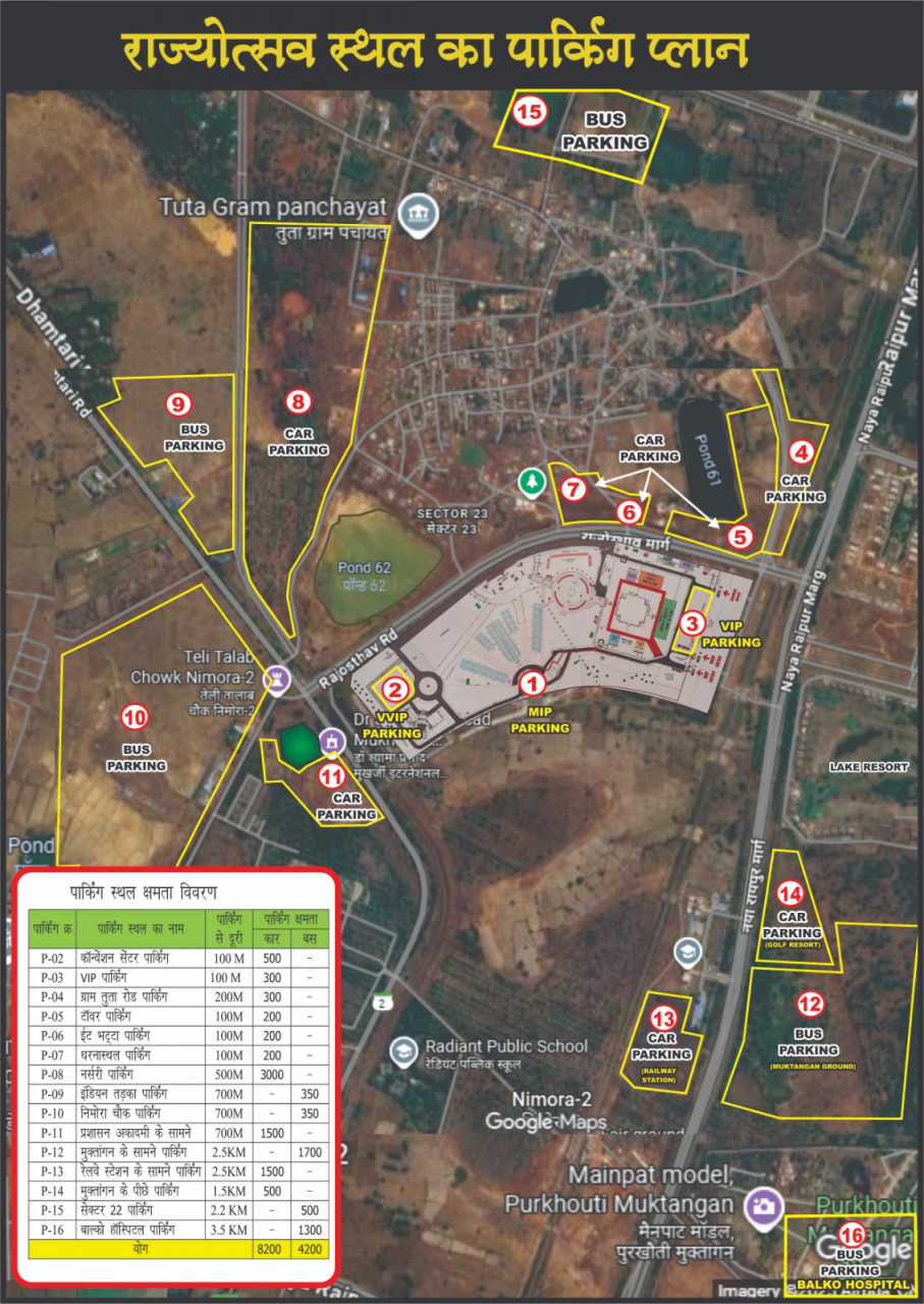 इसी तरह रूट-05 में रायपुर शहर, धरसींवा, दुर्ग, बालोद, खैरागढ़, राजनांदगांव की ओर आने वाले वाहनों के लिए राज्योत्सव स्थल तक पहुॅच मार्ग निर्धारित है। पचपेड़ीनाका-बोरियाकला-माना बस्ती-तूता होकर तूता मैदान पार्किंग स्थल पी-08, तूता इंडियन तड़का ढाबा के पास पार्किंग स्थल पी-09 एवं निमोरा बस्ती मार्ग दालमिल के पीछे पार्किंग स्थल पी-10 में अपना वाहन पार्क कर राज्योत्सव स्थल पैदल जा सकेंगे।
