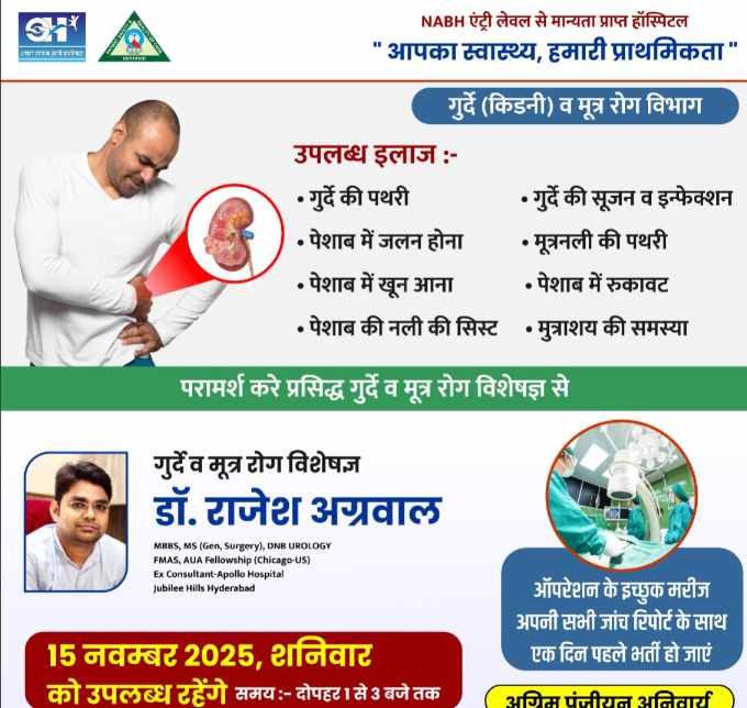 सरायपाली: ओम हॉस्पिटल में 15 नवंबर को गुर्दे व मूत्र रोग विशेषज्ञ डॉ. राजेश अग्रवाल देंगे सेवाएं