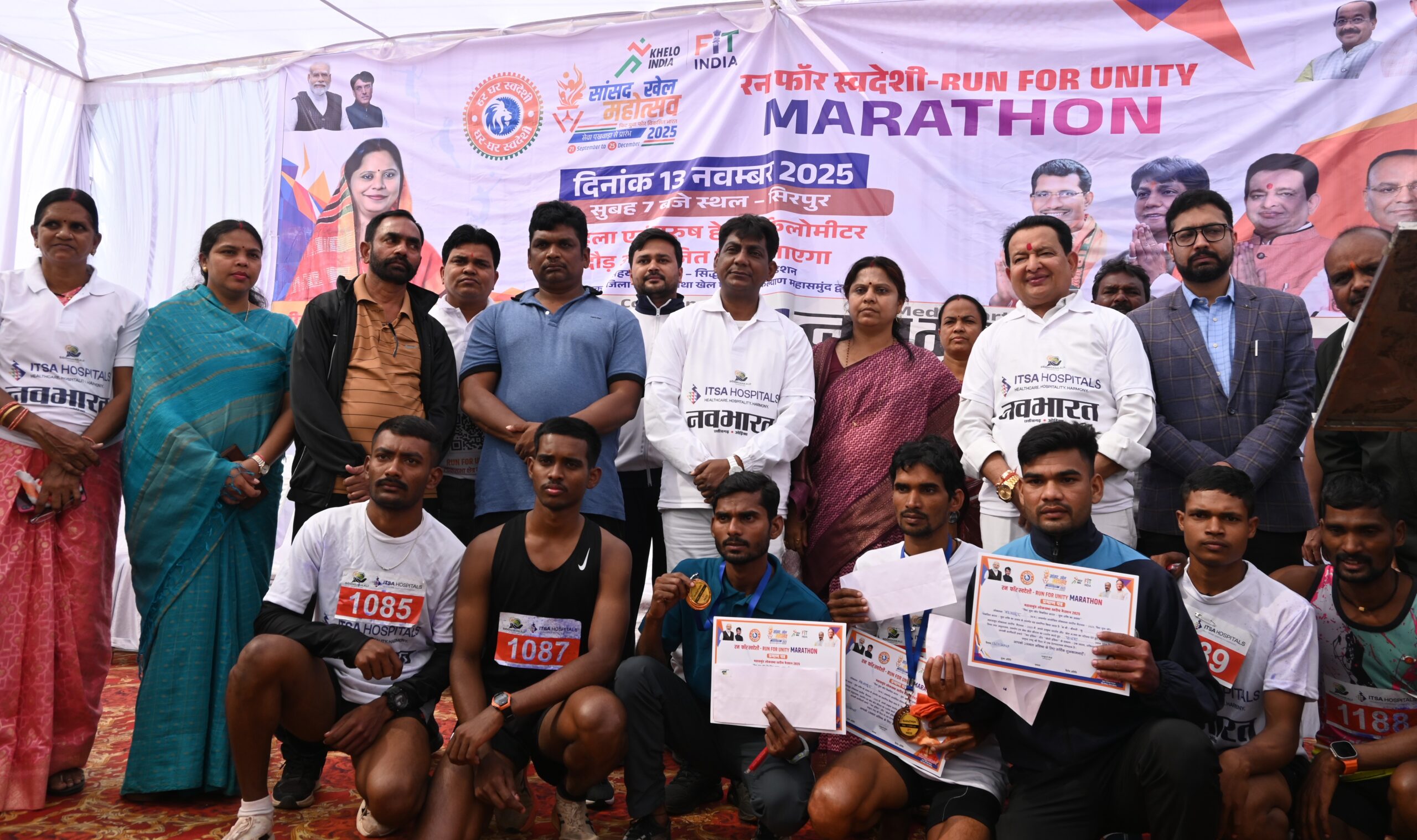 रन फॉर यूनिटी मैराथन में युवाओं ने लगाई एकता और देशभक्ति की दौड़ सिरपुर के ग्राम मरौद से 5 किमी की दौड़ सांसद, विधायक ने दिखायी हरी झंडी महिला एवं पुरुष वर्ग के 10-10 विजेताओं को मिले पुरस्कार