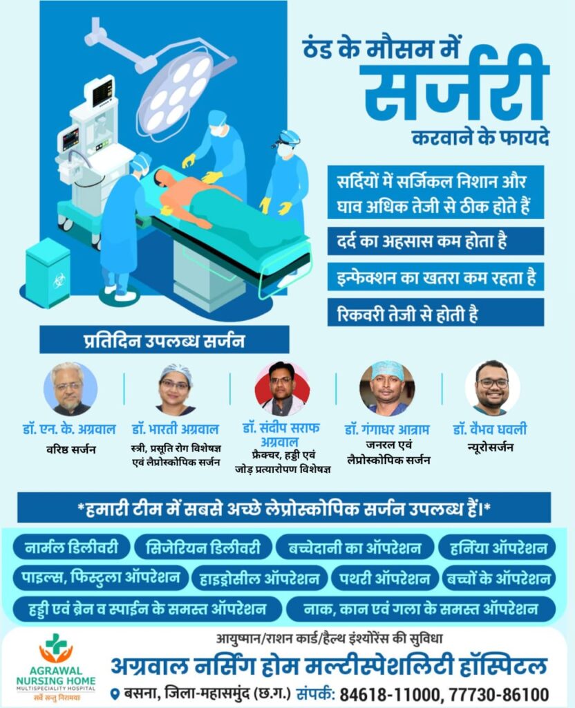 बसना। अग्रवाल नर्सिंग होम मल्टीस्पेशियलिटी हॉस्पिटल ने सर्दियों में सर्जरी कराने के फायदे बताते हुए लोगों से समय पर उपचार कराने की अपील की है।