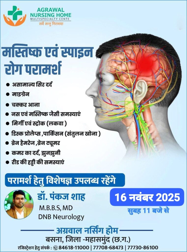 बसना। अग्रवाल नर्सिंग होम में 16 नवंबर 2025 को सुबह 11 बजे से प्रसिद्ध न्यूरोलॉजी विशेषज्ञ डॉ. पंकज शाह (MBBS, MD, DNB Neurology) मस्तिष्क एवं स्पाइन संबंधी रोगों का परामर्श देंगे।