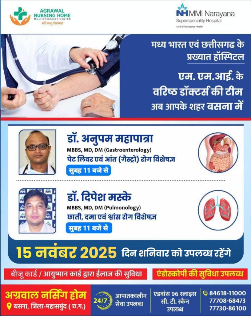 बसना में स्वास्थ्य सेवाओं का बड़ा केंद्र: 15 को गैस्ट्रो–चेस्ट विशेषज्ञ, रोज़ाना सर्जरी सुविधाएँ और 16 को न्यूरोलॉजी सुपरस्पेशियलिस्ट का विशेष परामर्श अग्रवाल नर्सिंग होम में
