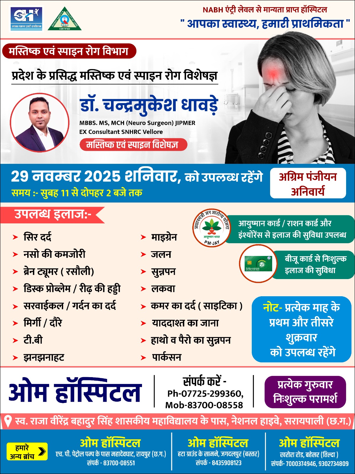 सरायपाली। ओम हॉस्पिटल में मस्तिष्क एवं स्पाइन रोग विभाग द्वारा प्रदेश के ख्यातिप्राप्त न्यूरोसर्जन डॉ. चन्द्रमुखेश धावड़े मरीजों का उपचार करने हेतु दिनांक 29 नवंबर 2025 शनिवार को सुबह 11 बजे से दोपहर 2 बजे तक उपलब्ध रहेंगे।गंभीर न्यूरोलॉजिकल रोगों के मरीजों के लिए यह सुनहरा अवसर माना जा रहा है।