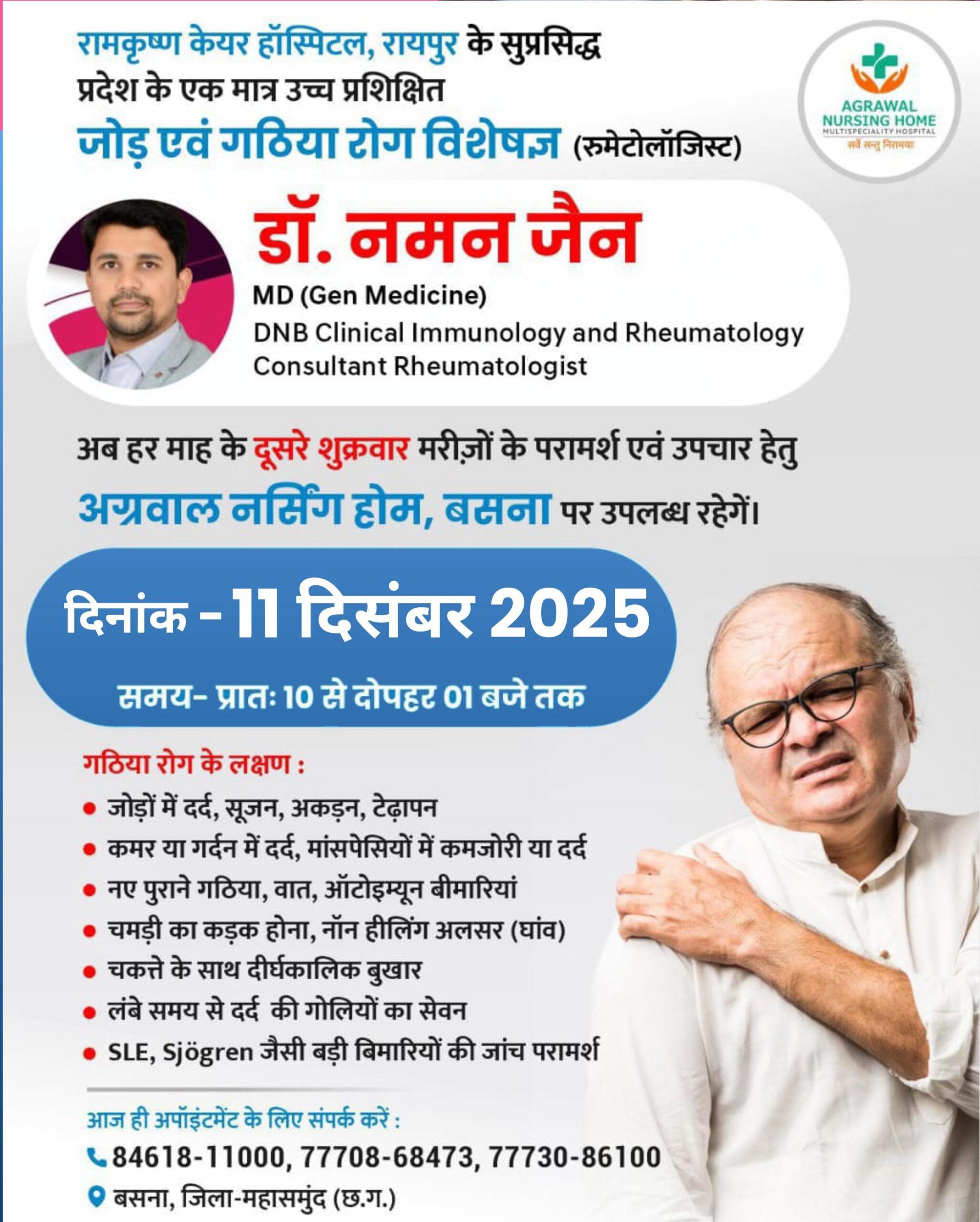 बसना। प्रदेश के सुप्रसिद्ध रूमेटोलॉजिस्ट एवं रामकृष्ण केयर हॉस्पिटल रायपुर के प्रशिक्षित जोड़ एवं गठिया रोग विशेषज्ञ (रूमेटोलॉजिस्ट) डॉ. नमन जैन 11 दिसंबर 2025 को बसना पहुंच रहे हैं। मरीजों की सुविधा के लिए वे हर माह के दूसरे गुरुवार उपचार हेतु उपलब्ध रहते हैं। इस दौरान वे अग्रवाल नर्सिंग होम, बसना में ओपीडी लगाएंगे।परामर्श समय सुबह 10 बजे से दोपहर 1 बजे तक रहेगा।