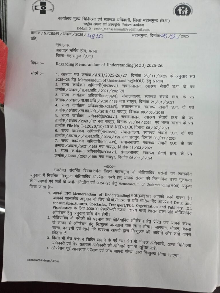 मोतीयाबिंद ऑपरेशन के लिए जिला प्रशासन नर्सिंग होम के बीच समझौते पत्र जारी किया है , अब मरीजों को मिलेगी निःशुल्क सुविधा महासमुंद। जिले में मोतीयाबिंद मरीजों को बेहतर स्वास्थ्य सुविधाएं उपलब्ध कराने हेतु जिला प्रशासन और बसना स्थित नर्सिंग होम के बीच वर्ष 2025-26 के लिए Memorandum of Understanding (MOU) किया गया है। मुख्य चिकित्सा एवं स्वास्थ्य अधिकारी कार्यालय द्वारा जारी पत्र के अनुसार अब मोतियाबिंद के मरीजों को शासन की गाइडलाइन के अंतर्गत पूरी तरह निःशुल्क ऑपरेशन सुविधा प्रदान की जाएगी।