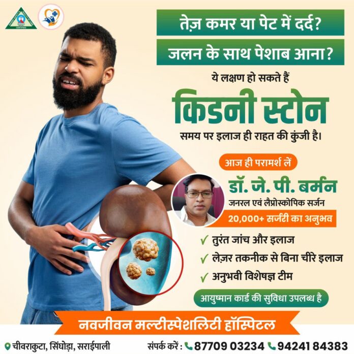 सरायपाली। क्षेत्र में बढ़ते किडनी स्टोन के मामलों को देखते हुए नवजीवन मल्टीस्पेशयलिटी हॉस्पिटल ने उन्नत उपचार सुविधाओं को और सशक्त किया है। अस्पताल में जनरल एवं लेप्रोस्कोपिक सर्जन डॉ. जे. पी. बर्मन, जो 20,000 से अधिक सर्जरी का अनुभव रखते हैं, किडनी स्टोन के मरीजों को आधुनिक लेज़र तकनीक से बिना चीरे सुरक्षित इलाज प्रदान कर रहे हैं।