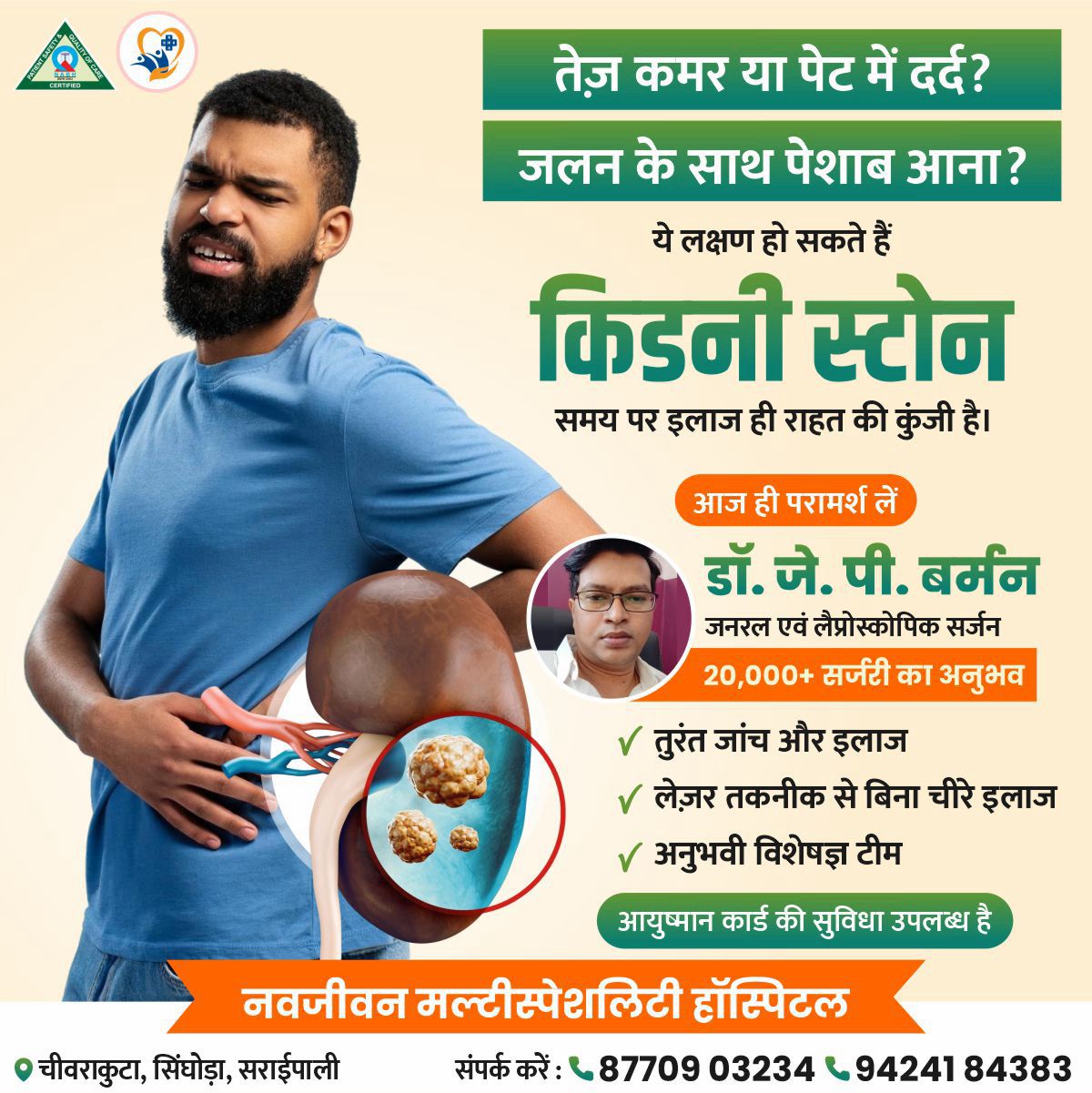 सरायपाली/ तेज़ कमर–पेट दर्द और पेशाब में जलन? डॉ. जे. पी. बर्मन की लेज़र तकनीक से किडनी स्टोन मरीजों को मिल रही राहत नवजीवन मल्टीस्पेशयलिटी हॉस्पिटल में