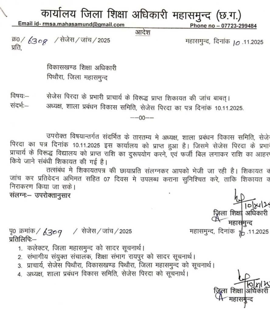 पिथौरा/स्वामी आत्मानंद हिंदी अंग्रेज़ी माध्यामिक विद्यालय पिरदा के प्राचार्य की गंभीर लापरवाही के मामले में जांच पूरी होने के बावजूद अब तक कोई ठोस कार्रवाई नहीं हुई है। जांच किए लगभग 15 दिन होने वाले हैं, लेकिन जिला प्रशासन और शिक्षा विभाग इस मामले में ढील दिखाते नजर आ रहे हैं।