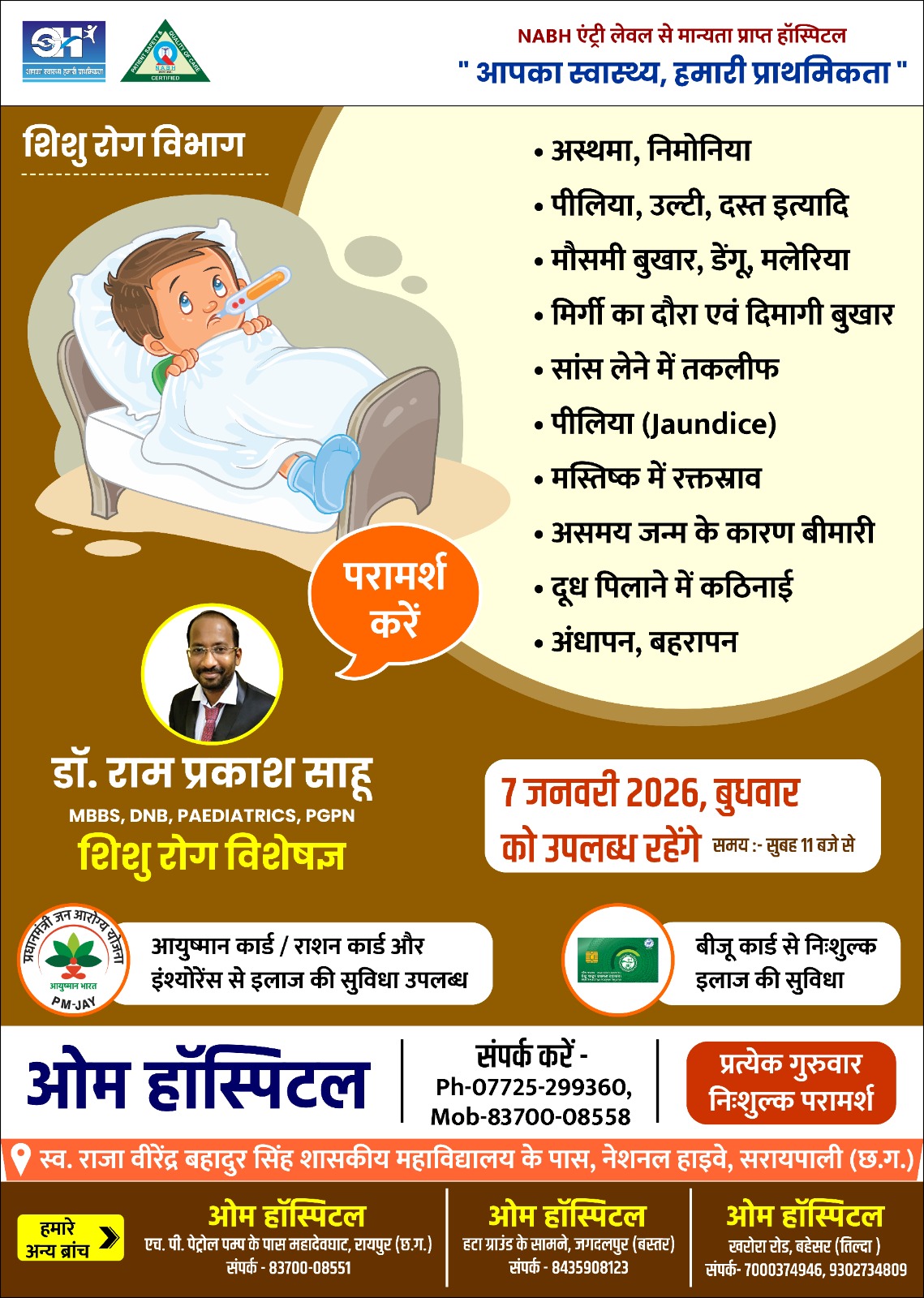 सरायपाली एनएबीएच एंट्री लेवल से मान्यता प्राप्त ओम हॉस्पिटल में दिनांक 7 जनवरी 2026, बुधवार को विशेष शिशु रोग परामर्श शिविर का आयोजन किया जा रहा है। इस अवसर पर शिशु रोग विशेषज्ञ डॉ. राम प्रकाश साहू (MBBS, DNB, Paediatrics, PGPN) बच्चों से जुड़ी विभिन्न बीमारियों का परीक्षण एवं परामर्श देंगे।