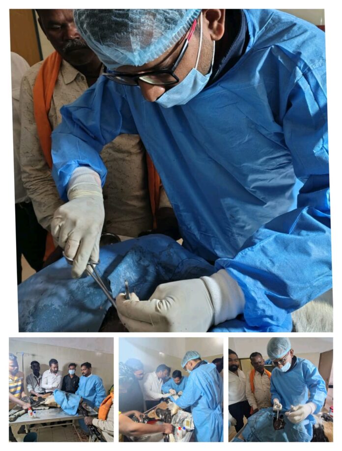 महासमुंद/ जिला पशु चिकित्सालय महासमुंद में गंभीर बीमारी एवं अस्वस्थ पशुओं का निःशुल्क उपचार किया जाता है। इसी कड़ी में आज विकासखंड महासमुंद अंतर्गत ग्राम नांदगांव के पशुपालक श्री डोमार यादव की 3 वर्षीय संकर बीटल बकरी का सफलतापूर्वक सिजेरियन ऑपरेशन किया गया। बकरी पिछले दो दिनों से गंभीर प्रसव पीड़ा में थी, जिसे उपचार हेतु जिला पशु चिकित्सालय लाया गया था।
